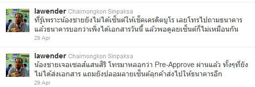 จากนั้นอีกสักพัก ก็มีโทรศัพท์มาครับ แจ้งว่ามาจากเจ้าหน้าที่ธนาคาร โทรมาเพื่อขอตรวจสอบข้อมูลที่เรายื่น Pre-Approve ไป ซึ่งน้องชายผมก็ถามว่า อ้าว… ไหนเซลส์โทรมาบอกว่าผ่านแล้วล่ะ รอแค่ผลทางการออก ซึ่งเจ้าหน้าที่ก็ตรวจว่าผลยังไม่ออก และเอกสารเพิ่งส่งเข้ามาที่สำนักงานเมื่อเช้านี้เอง แล้วเธอก็เพิ่งจะโทรมาตรวจสอบข้่อมูล มันจะผ่านแล้วได้อย่างไรจ๊ะ…