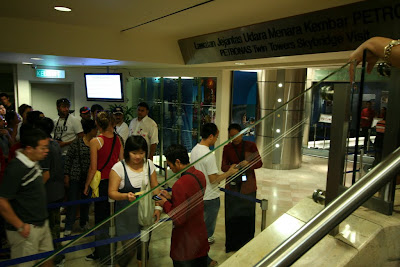 ตึก petronas หรือที่คนที่นั่นเรียก twin towers จะมีบริการให้นักท่องที่ยวขึ้นไปเดินบนทางเชื่อมระหว่าง 2 ตึก ที่เรียกกันว่า sky bridge ครับ เพื่อชมความสวยงามของ KL โดยจะเปิดให้มารับตั๋วได้ตั้งแต่ 8 โมงเช้า ซึ่งเค้าจะแบ่งเป็นรอบๆ รอบละ 15 นาที ซึ่งแต่ละรอบจะรับคนประมาณ 20 คนมั้ง ถ้าผมจำไม่ผิด
